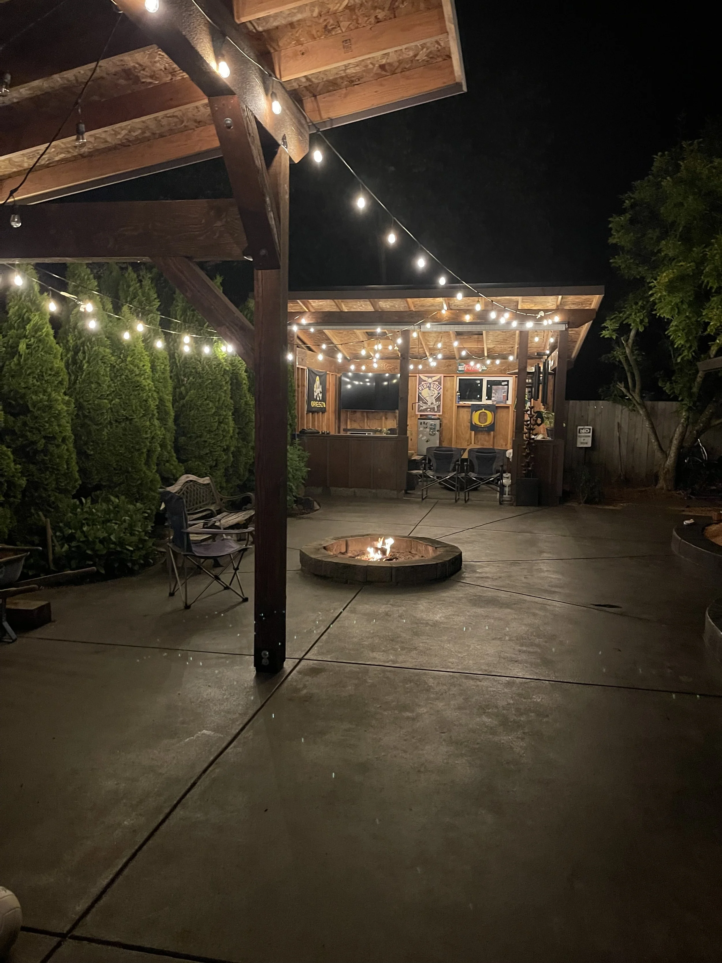 CHIPPER FOUNDATION TIMBERLINE DRIVEWAY GRANTS PASS FOUNDATION AND SLAB GERIG’S 160YR OLD HOME RESTORATION PROJECT LINN COUNTY FAIRGROUNDS Backyard Lounge, Fire pit, Koi Pond, and Back Patio